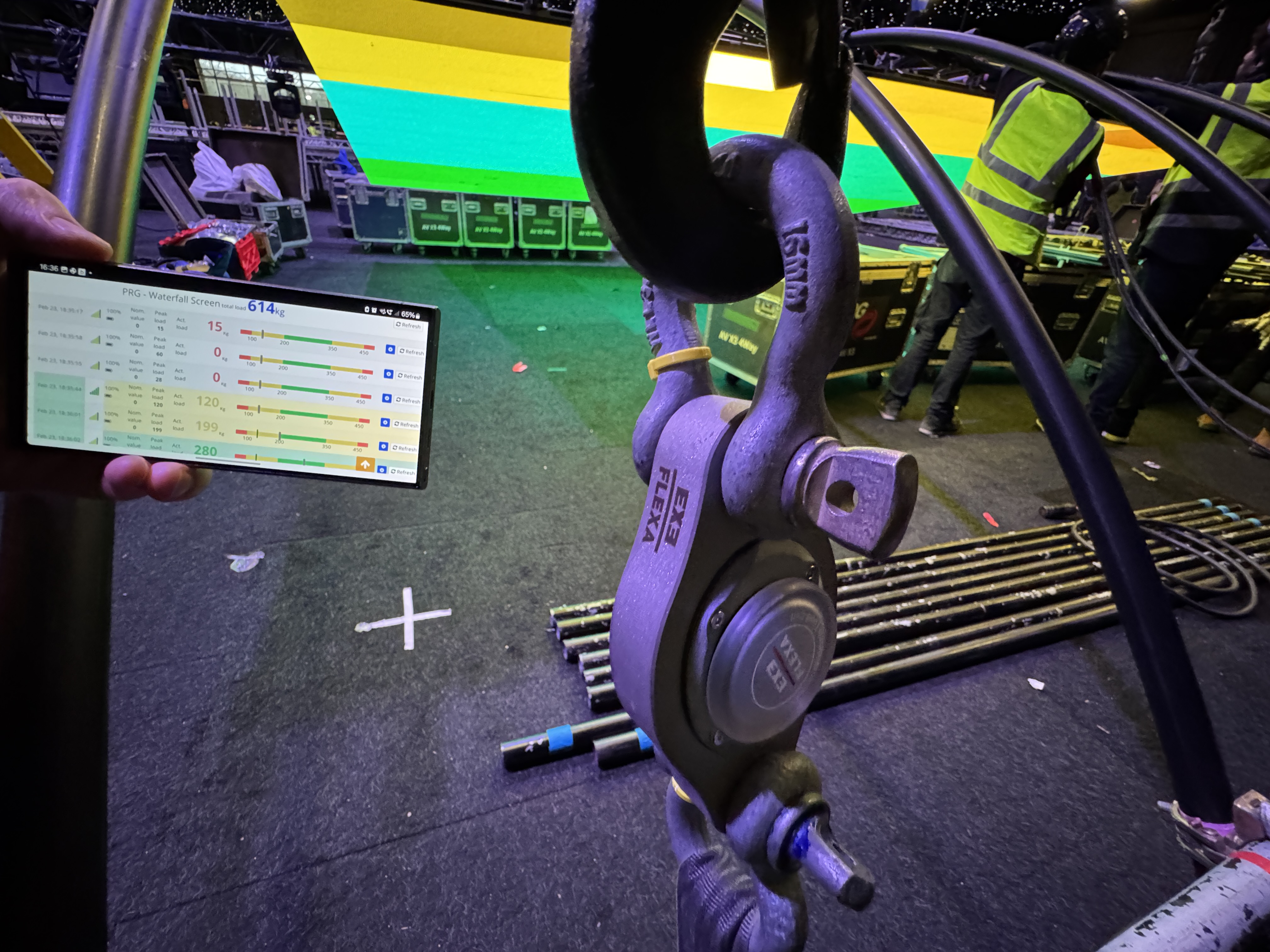x12 EXE FLEXA Dynamic load cells monitored two complex LED screen installations under the watchful eye of both Encore and PRG, whilst x12 EXE FLEXA Real-Time cells monitored the main lighting trusses suspended above the main bar area. The team were able to watch and record the entire rigging process pre-show and throughout the duration of the event.