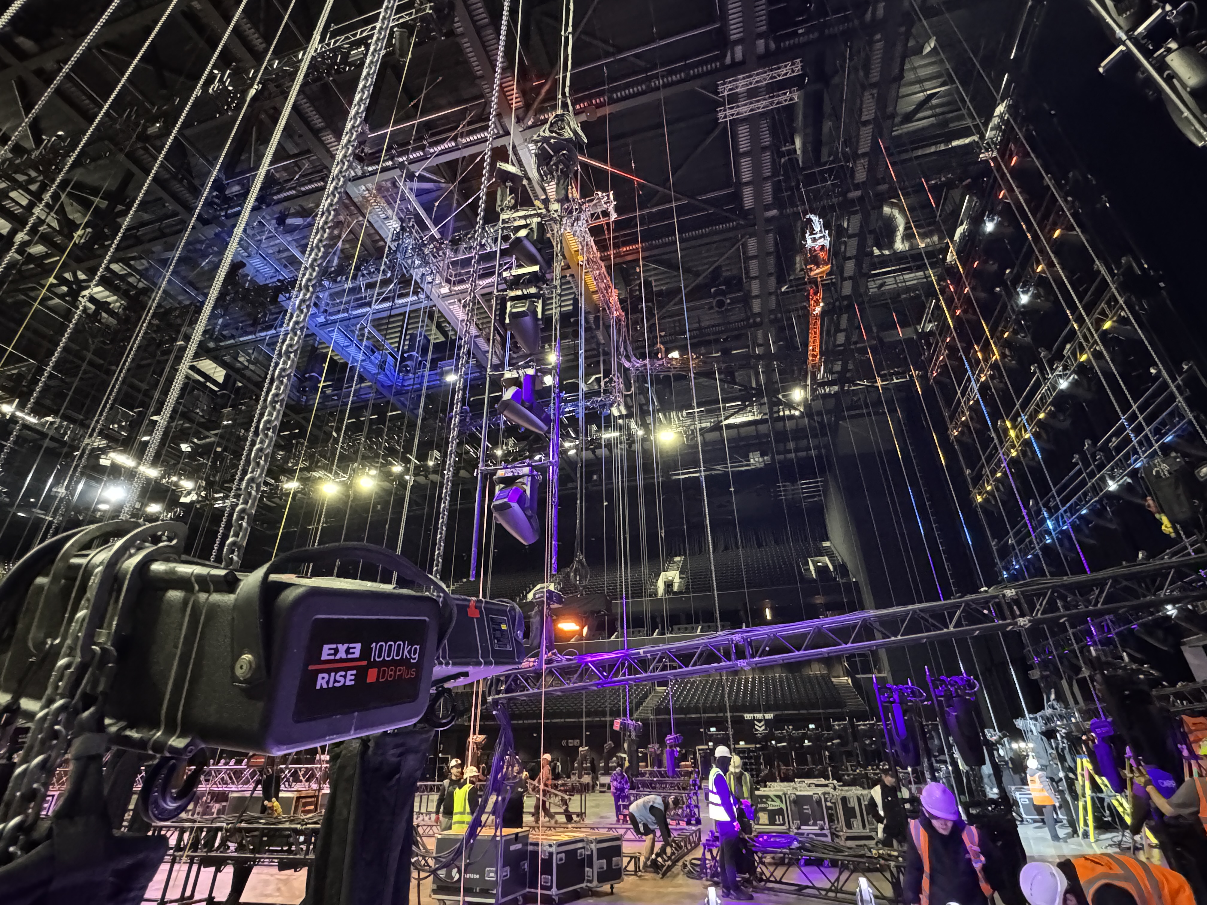 A show of this scale and complexity requires rigging data to monitor from the initial build through to the show going live. The EXE Flexa wireless load cell system provides continuous, real-time visibility into the load weights across the rigs, capturing key data information that verifies weight distribution, monitors dynamic movement, and maintains safety throughout every performance. The rigging team deployed EXE Flexa Load Cells on two key video elements: the video header at 11 tons and the upstage screen at 3 tons, whilst monitoring the mother grid at 8 tons and the upstage stacked lighting trusses, which weighed 5 tons.