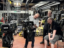 “The rigging department at the National Theatre are fantastic to work with, their technical astuteness and out of the box thinking created a great collaboration that resulted in different chain hook attachments for some of their EXE Rise fleet. The modification was required to enable the hoists' chain to be passed through the grid in a venue and a solution was found utilising alternative chain attachments of appropriate size. The EXE Medium frame 350Kg units were selected due to their size-to-weight ratio, which perfectly suited the confined spaces in the grid loft, allowing for ease of installation and manoeuvrability once inside the grid space.”