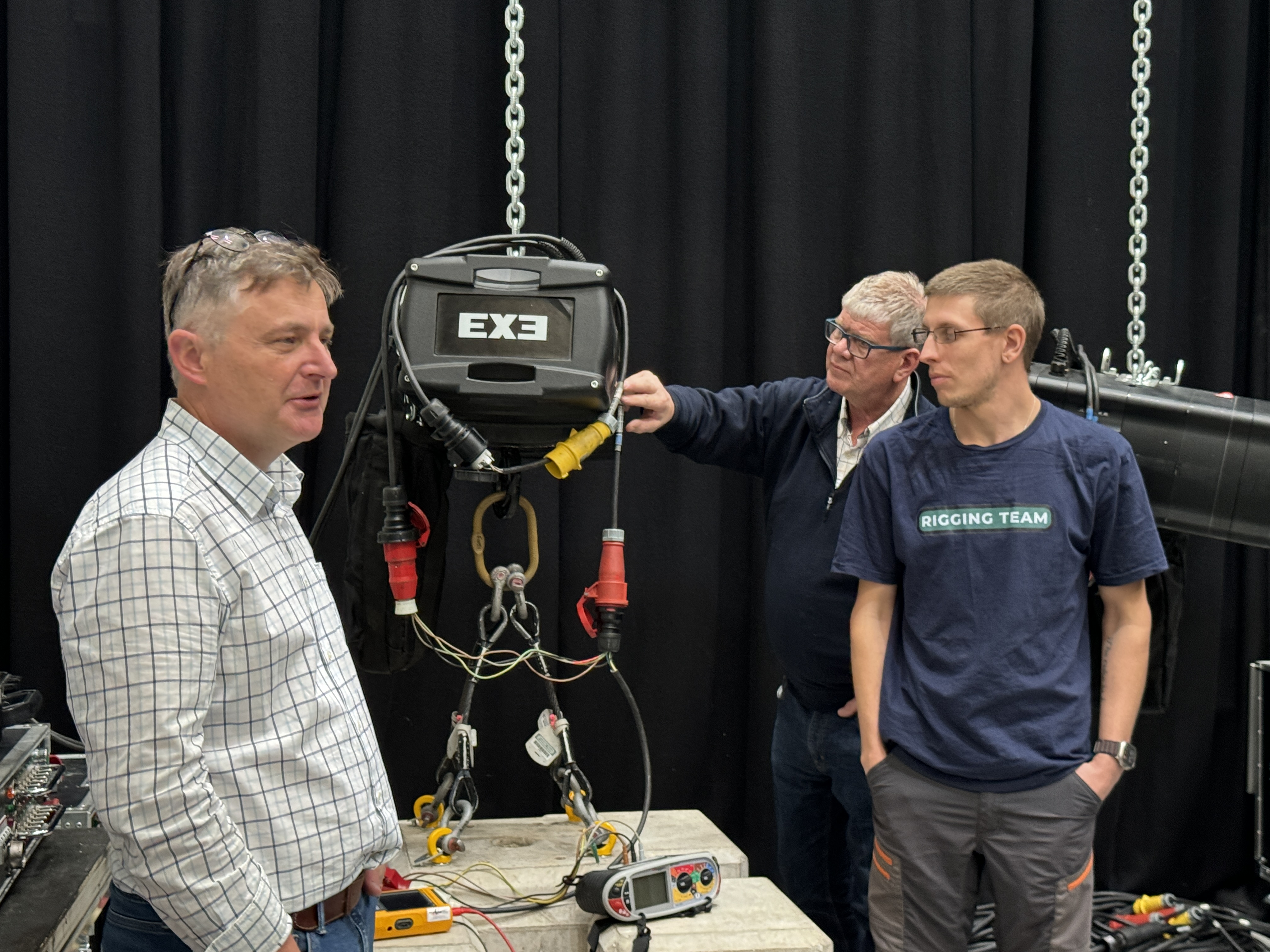 James Eade and Matt Millward from EXE Technology led several technical sessions, offering deep insights into modern rigging practices. Topics covered included advanced electrical load calculations, system integration, and best practices for maximising both safety and efficiency on the job. Delegates also explored the subjects of ‘PAT’ testing kit, RCDs on variable speed drives, electrical safety compliance and the application of BS 7909 to rigging systems. While there was a strong emphasis on safety and compliance, protection and effective electrical design to mitigate equipment damage remained the pivotal focal point and cornerstone of the entire training program.